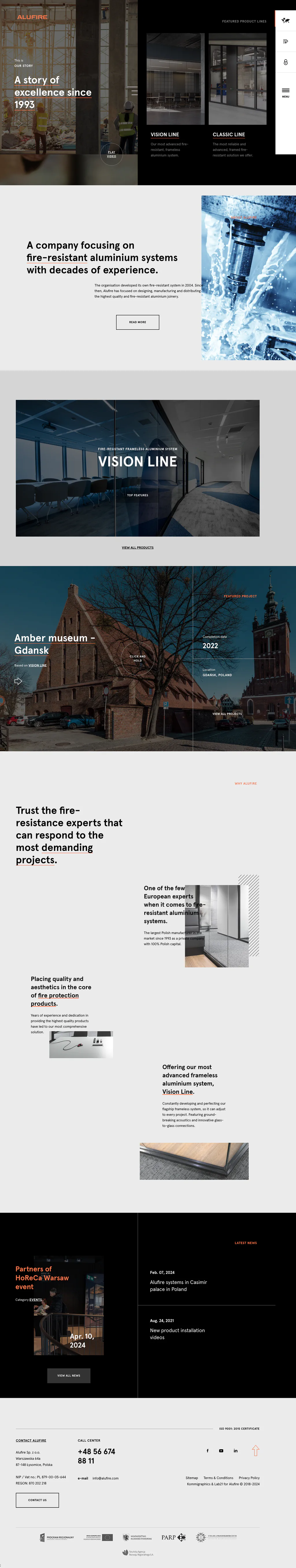 The website showcases a range of products, including frameless and framed systems, fire-resistant doors, and advanced glazing solutions. Alufire’s flagship product, the Vision Line, offers a sleek, frameless design with impressive noise reduction and minimal silicone use.