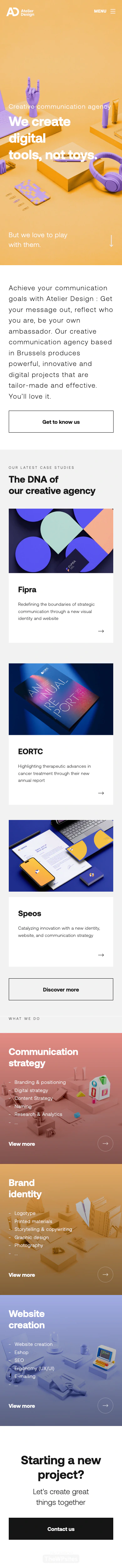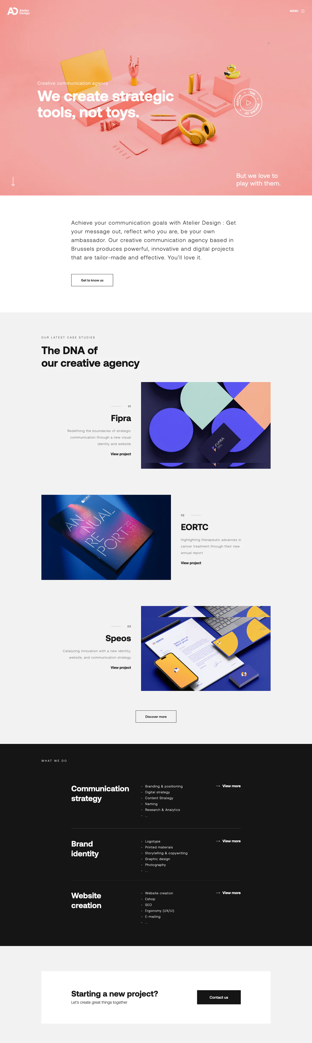 The website showcases some of Atelier Design’s past work with clients like Fipra, EORTC, and Speos. If you’re interested in working with Atelier Design, you can contact them via email or phone.