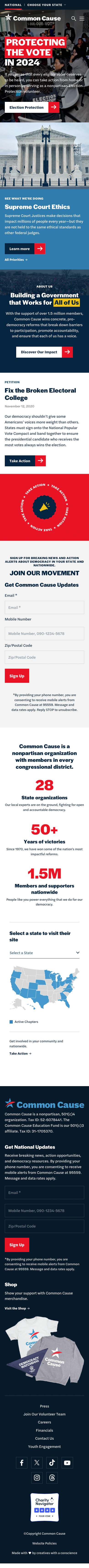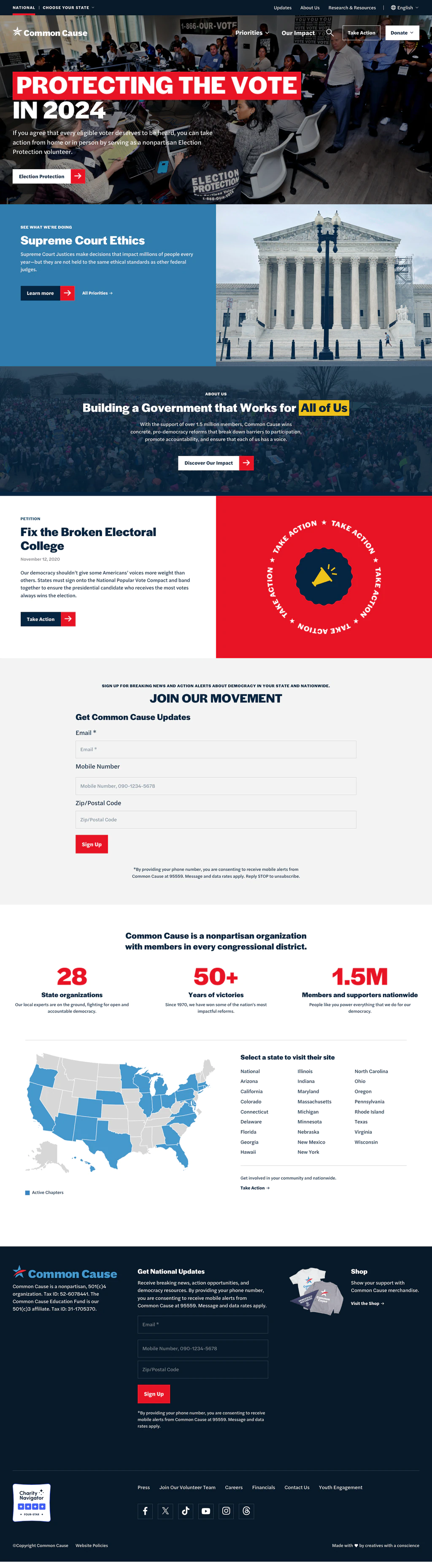 The theme of the site is clean and straightforward, with a user-friendly layout that highlights key information without overwhelming visitors. The design features a mix of vibrant and subdued colors, making the site both eye-catching and approachable. Overall, the visual elements complement the mission-driven content well, providing a professional yet inviting atmosphere for users interested in supporting democratic reform.