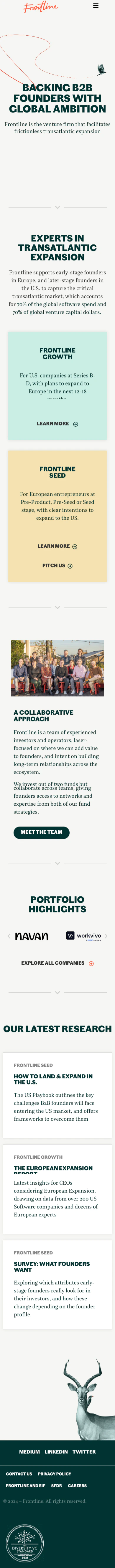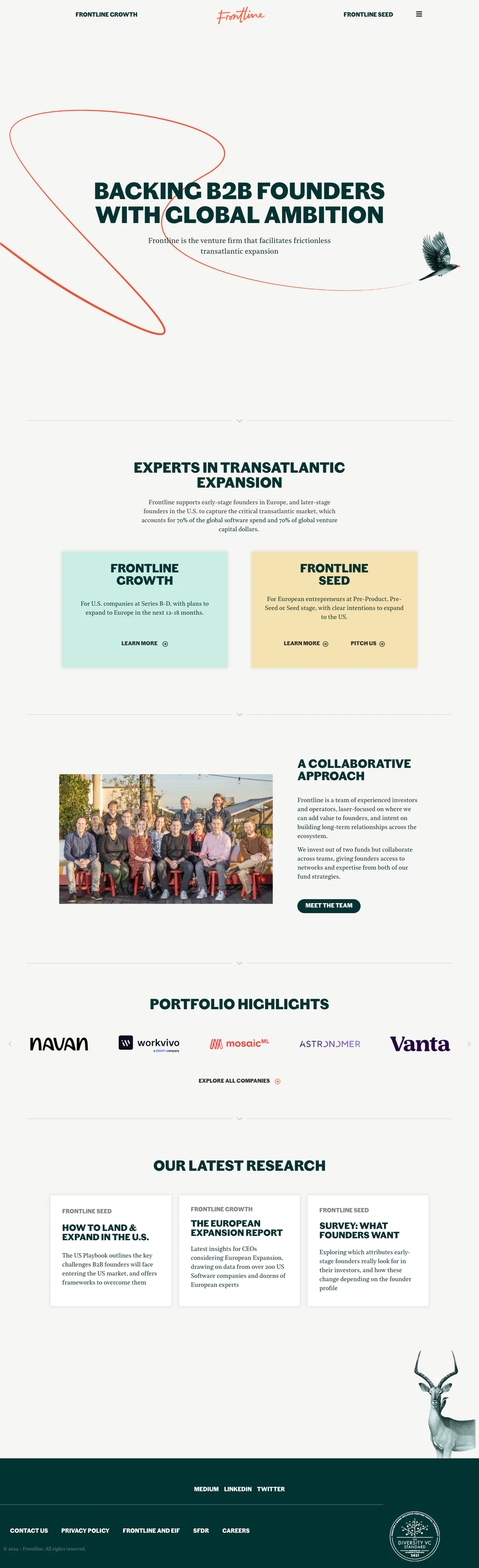 The website has a bright, modern look that immediately feels welcoming and innovative. The color scheme, featuring white backgrounds with bold pops of blue and orange, creates a fresh, energetic vibe that aligns with the firm’s focus on startups and growth. The layout is clean, with well-organized sections that make it easy to explore their approach, portfolio, and resources. The use of high-quality imagery and interactive elements gives the site a dynamic feel, reflecting Frontline’s mission to foster innovation and support entrepreneurial growth. It’s a well-crafted, visually engaging site that mirrors the firm’s forward-thinking approach.