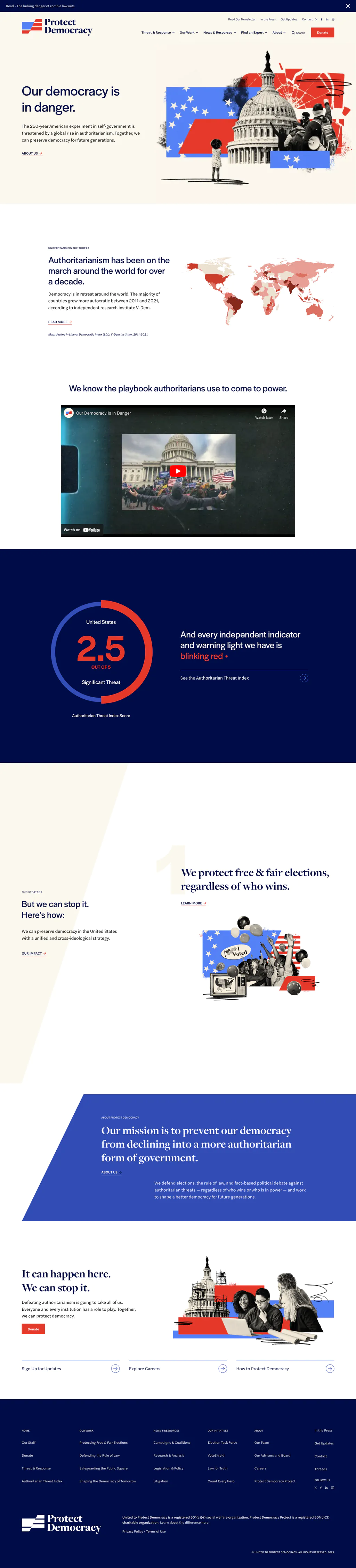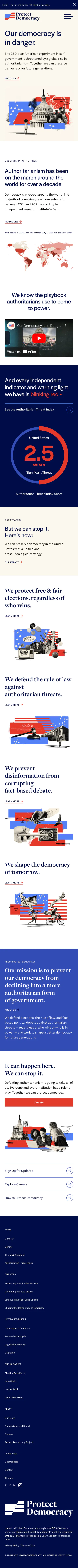Protect Democracy is a nonprofit organization dedicated to safeguarding democracy from authoritarian threats. Their mission is to prevent the erosion of democratic norms in the U.S. through a combination of legal action, advocacy, and public education. They focus on key areas like defending free and fair elections, protecting the rule of law, and combating disinformation.